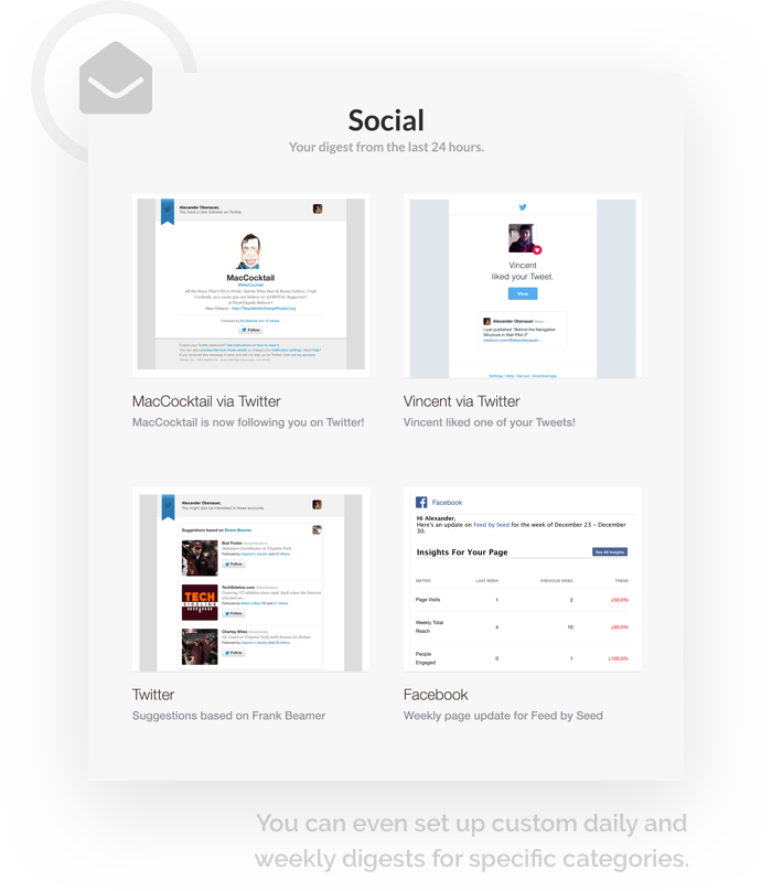 Combine all mass mailings and notifications into one daily digest email, reducing useless notifications and improving all-day focus.